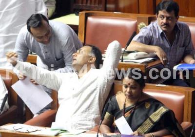 Photo Caption : Ministers Dinesh Gundurao with Umashree and MLA Zameer Ahamed Khan seen during Assembly session at Vidhan Soudha, in Bengaluru on Tuesday 29th March 2016