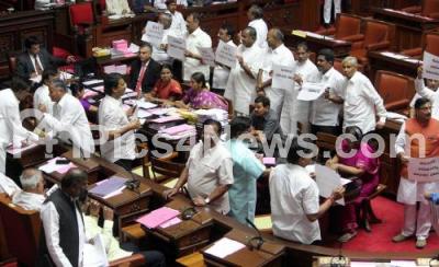 Photo Caption : Opposition Council members seen protesting against the state government during the Council Session at Vidhan Soudha, in Bengaluru on Wednesday 30th March 2016