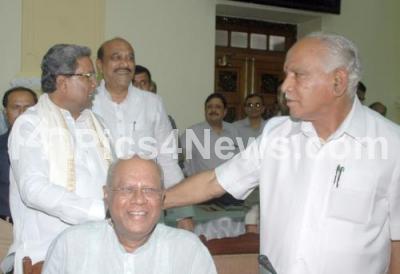 Photo Caption : Chief Minister Siddaramaiah who chaired a high level meeting to discuss the controversial Kalasa Banduri Water Project with floor leaders of the State Legislature, Members of Parliament, Legislators of the Concerned Districts and Leaders of the Farmers from four districts of Haveri, Gadag, Hubballi and Dharwad , also seen are B S Yeddyurappa, MP and VP BJP National President, Union Ministers Ananth Kumar, DV Sadananada Gowda, Ministers Dr G Parameshwar, MB Patel, HK Patil, Jagagdeesh Shettar, KS Eshwarappa, Basavraj Horatti, Basavaraj Bommai and others at Conference Hall, Vidhana Soudha, in Bengaluru on Saturday 2nd April 2016