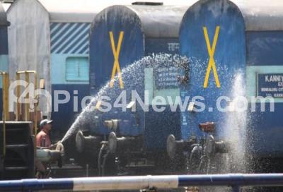 Photo Caption : Railway staffer seen washing the bogies parked at the Bengaluru City Railway Station in this hot weather, in Bengaluru on Tuesday 5th April 2016