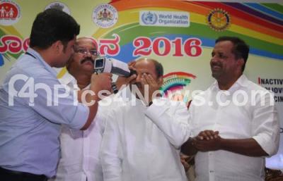 Photo Caption : Minister Sharan Prakash Patil being checked during the medical test camp for diabetes, blood test and Eye Test on the occasion of World Health Day program at Banquet Hall, Vidhan Soudha, organised by dept of Health and Family welfare , in the presence of Minister UT Khader and others, in Bengaluru on Thursday 7th April 2016
