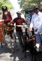 Members of Kannada Chaluvalu Vatal Paksha led by Vatal Nagaraj celebrating Sankranti festival with domestic animals at SBM Circle, in Bangalore on 15th of Jan 2012