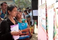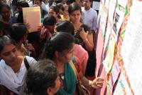 Candidates looking for some good jobs on the notice board at the Udyoga Mela 2012 at Sirur Park play ground in Sheshadripuram, in Bangalore on Friday 10th February 2012