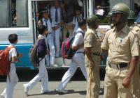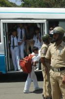 Students trying to catch a bus after their exams near Gandhi Statue as the police kept a tight vigilance for the media protest rally, in Bangalore on Saturday 3rd March 2012