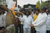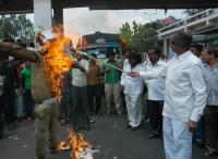 Members of Kannada Chaluvali Vatal Paksha led by Vatal Nagaraj seen burning the effigy for the Railway Budget Issue at Kempegowda Bus Station, in Bangalore on Thursday 15th March 2012