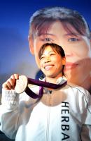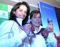 | Event Details: | Saina Nehwal, Badminton Star with MC Mary Kom, Boxing Champion seen displaying the Bronze Medals, during the Felicitation Ceremony to the Shining stars of London Olympics, organized by Herbalife at Chancer Pavillion, in Bangalore on Wednesday 22nd August 2012 |