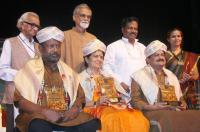 Srinivasa G Kappanna with Mandya Ramesh and Lakshmi Chandrashekhar being felicitated by TS Nagabharana and others during the Drushya Natakotsava 2013 at KH Kalasoudha, in Bangalore on Thursday 28th March 2013
