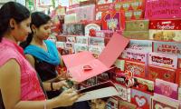 Girls purchasing Greeting Cards, on the eve of Valentines Day, at Malleshwaram, in Bangalore on Thursday 13th February 2014