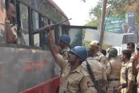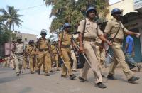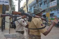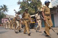 Contingent of Armed Police from Maharashtra State Reserve Police Force taking out a flag march in busy residential areas of RT Nagar, in Bangalore on Tuesday 1st April 2014