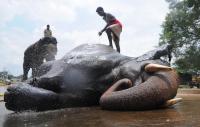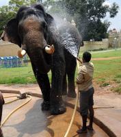 Dasara Jumbos being showered, ahead for Dasara Mahotsav 2014, at Mysore Palace premises, in Mysore on Thursday 21st August 2014