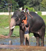 Children play with Dasara Jumbos, while Elephants take bath, at Mysore Palace premises, in Mysore on Friday 26th September 2014