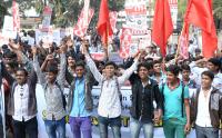 Members of AIDYO protesting to fulfill their various demands, at City Railway Station, in Bengaluru City on Friday 9th January 2015