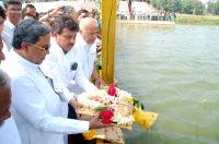 Siddaramaih , Chief Minister of Karnataka seen offering Bagina in river Krishna during his visit to Bagalkot, on Saturday 31st January 2015