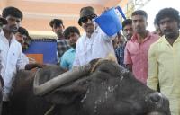 Members of Kannada Chaluvali Vatal Paksha and its President Vattal Nagaraj protesting with buffalo at Kempegowda Bus stand , in Bengaluru on Sunday 1st February 2015