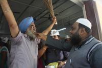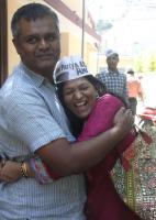 AAP members treating each other with sweets in celebration for the AAP victory in Delhi elections, the celebrations were seen at the AAP party office in Bangalore on Tuesday 10th February 2015