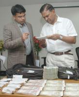 | Event Details: | MN Reddi, Commissioner of Police seen inspecting the counterfeit notes valued around Rs 9,13 lakhs and hard currency worth Rs 1,72 lakhs and counterfeit materials were seized from a six member gang by the DCP West Police displayed at Commissioner Office, also seen is Chandrasekhar, Joint Commissioner Crime , in Bengaluru on Tuesday 31st March 2015 |