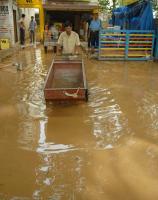 People seen struggling to pass through the rain water clogged in Gandhinagar due to the last night heavy rain, in Bengaluru on Saturday 25th April 2015
