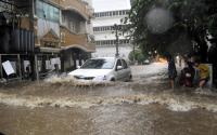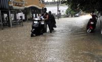 People seen passing through waves of rain water on the roads of Ejipura near Koramangala as heavy rain lashed out Bengaluru City, in Bangalore on Saturday 25th April 2015