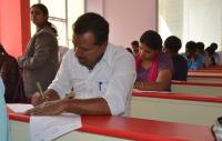 UT Khader, Health Minister seen writing his MA open university exam at Austin College, Chamrajpet, in Bengaluru on Tuesday 19th May 2015