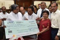 CM Siddaramaiah receiving a cheque of Rs 1 crore and 10 lakhs for Nepal earthquake relief fund by Karnataka Silk Industries Ltd, in Bengaluru on Thursday 21st May 2015
