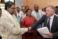 | Event Details: | CM Siddaramaiah being greeted and invited by James Hogg of new Pharmaceutical Factory Global Manufacturing and Supply for the laying the foundation stone on 8th September at Vemgal Industrial Area, the meeting was held at CMs residence Cauvery, in Bengaluru on Wednesday 12th August 2015 |