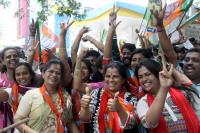 BJP supporters celebrates their victory in BBMP election at BJP party office at Malleswaram, in Bengaluru on Tuesday 25th August 2015