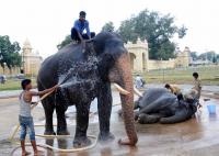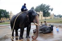 Dasara elephants taking bath in the pond at Mysore Palace as part of the ritual in Mysuru on Thursday 24th September 2015
