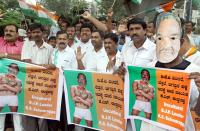 | Event Details: | Members of Bengaluru City Youth Congress protesting against BJP MLC KS Eshwarappa at Gandhi Statue, Anand Rao Circle, in Bengaluru on Monday 12th October 2015 |