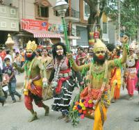Minister Dinesh Gundurao being welcomed by an artist during Kannada Rajyotsava celebrations organized by Chamarajpet Kannada Rajyotsava Samiti at Chamarajpet, in Bengaluru on Sunday 1st November 2015