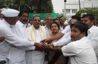 CM Siddaramaiah and Minister Umashree being greeted by congress workers from Terdal constituency at Krishna, in Bengaluru on Monday 9th November 2015