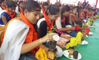 Students performing Tulasi Pooja during Hindu Spiritual and Service Fair at Basavanagudi National College Ground, in Bengaluru on Saturday 12th December 2015