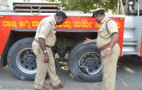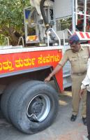 Fire department personnel seen inspecting the tyre of the fire tender vehicle which burst with a huge sound near Vikas Soudha, in Bengaluru on Wednesday 13th January 2016