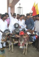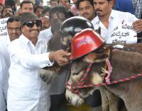 Vatal Nagaraj seen protesting in a unique way by making the donkeys wear helmet against the new helmet rule for pillion riders at SBM Circle, in Bengaluru on Wednesday 20th January 2016
