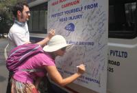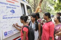 People participated in the head injury awareness campaign, urging people to wear helmet while driving at Malleswaram, in Bengaluru on Monday 21st March 2016