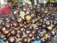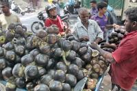People purchasing Sugar Palm fruit or Tatiningu to beat the heat at Dr Rajkumar Road, in Bengaluru on Tuesday 29th March 2016