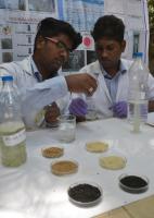 Students Abhishek and Mohammed Athiq seen demonstrating a water test and presented a effective solution to Bellandur Lake menace during a press conference at Press Cub, in Bengaluru on Saturday 28th May 2016