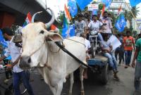 | Event Details: | NSUI seen protesting in a unique way by pulling a car and riding bullock carts and horses against the central government for the recent hikes in petrol and gas prices, the protest was held at Anand Rao Circle, in Bengaluru on Friday 3rd June 2016 |