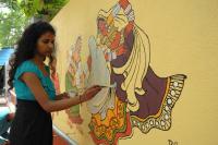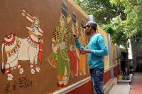 Artists painting on the wall for the beautification of Ravindra Kalakshetra premises, in Bengaluru on Wednesday 13th July 2016
