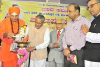 Sri Shiva Rudra Mahaswamiji with Former Union Minister MV Rajshekaran and others at the inauguration of the Dr Basava Danappa Jatti 104th birth day celebrations at Basava Bhavan, in Bengaluru on Sunday 11th September 2016
