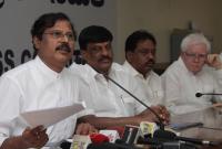 Congress leader VR Sudarshan and Congress Former Mayors of Bengaluru City addressing a press conference regarding the Steel Flyover at KPCC office, in Bengaluru on Saturday 15th October 2016
