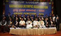 CM Siddaramaiah with Ministers KJ George and Pramodh Madhwaraj and others presented Karnataka Olympic Awards 2016 athletes in different sports at Yavanika, in Bengaluru on Monday 26th December 2016