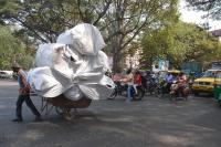 A man seen pulling a push cart with huge luggage on it at the busy SBM Circle, in Bengaluru on Tuesday 10th January 2017
