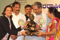 CM Siddaramaiah with Ministers Umashree and KJ George presented awards to women in various fields on the occasion of International Womens Day 2017 program at Ravindra Kalakshetra, in Bengaluru on Wednesday 8th March 2017