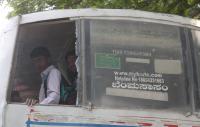 Damaged window pane of a BMTC bus, working as natural air conditioner, being driven in this hot sun at Queens Road, in Bengaluru on Thursday 13th April 2017