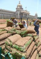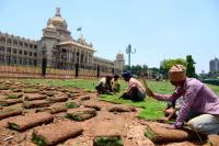 Workers laying new grass in the garden in front of Vidhan Soudha, in Bangalore on Sunday 30th April 2017