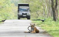 A 2 year old, Tigress seen resting at the closed old mysore and manandavadi (MM) road at Kabini, near Mysuru on Tuesday 6th June 2017