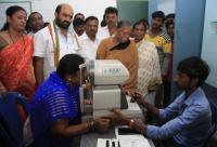 Mayor Padmavathi getting eye check up done during the inauguration of the Health camp for poor people at Manjunathnagar Constituency, in Bengaluru on Tuesday 26th September 2017