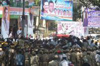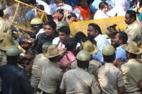 Congress leaders, workers and supporters protesting against BJP on the Mahadayi Water Project issue at KPCC office, in Bengaluru on Wednesday 27th December 2017
