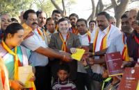 Members of Kannada Kriya Samiti distributing free Kannada books to the public at Sankey Tank to create awareness on Kannada language, in Bengaluru on Sunday 21st January 2018
