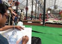 An artist painting the Bahubali statue replica being displayed during Republic Day Flower Show at Lalbagh, in Bengaluru on Sunday 21st January 2018